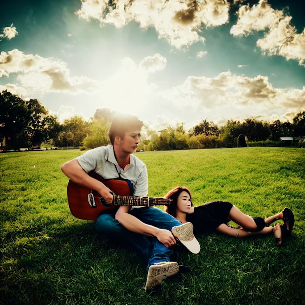Sky full of clouds and sun lil bit of grass area in riverside,man playing guitar and his girl lying in his lap