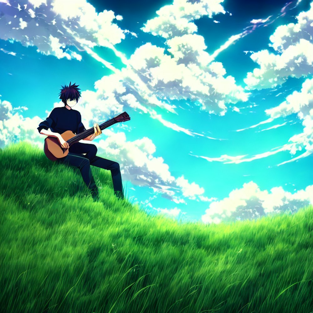 Anime style sky full of clouds, grass ground, a guy sitting and playing guitar