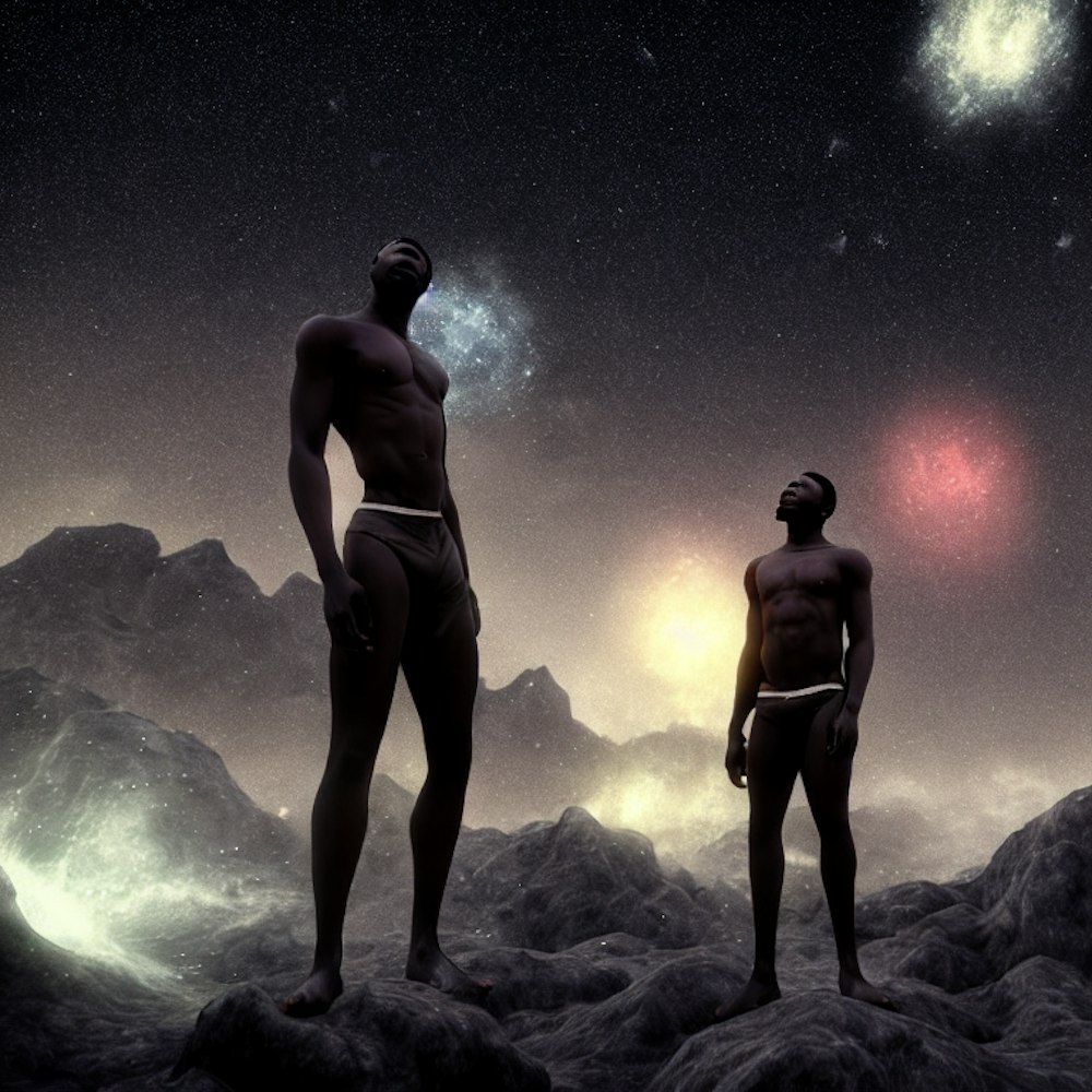 black Man by himself floating from void from darkness into the light (colored and black&white)