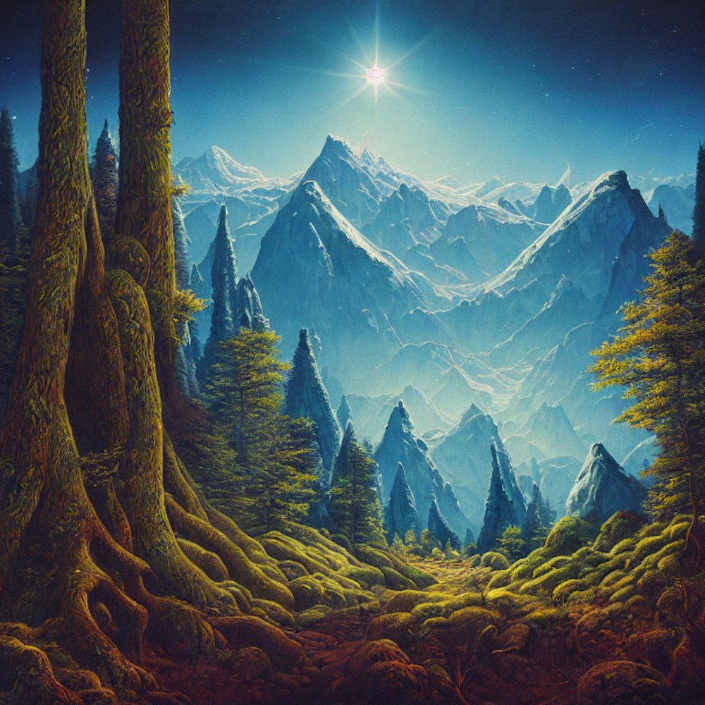 A painting of a forest landscape on a different planet, leading to 3 mountains with snow capped peaks, rendered in the style of a 1970’s progressive rock album cover