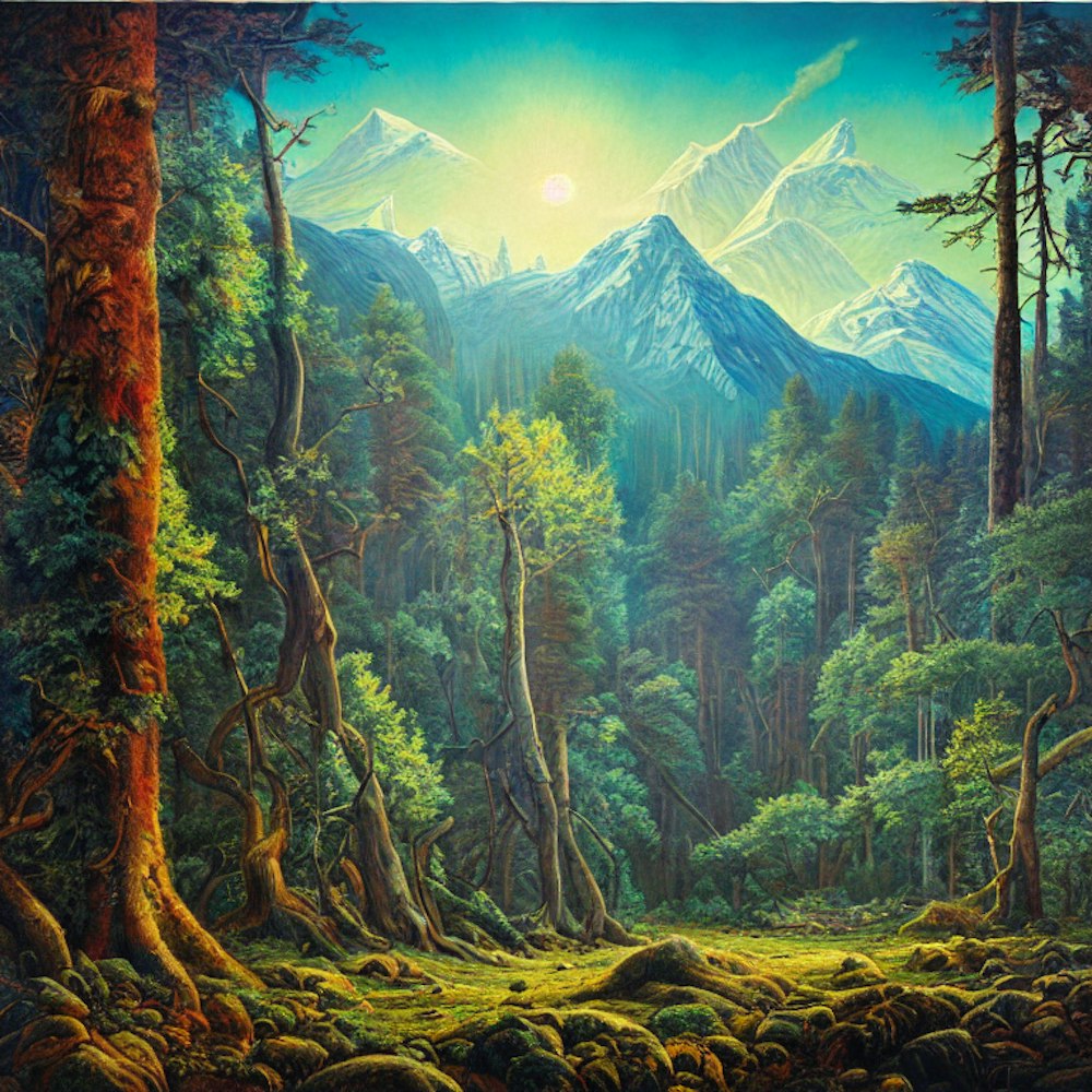 A painting of a forest landscape on a different planet, leading to 3 mountains with snow capped peaks, rendered in the style of a 1970’s progressive rock album cover