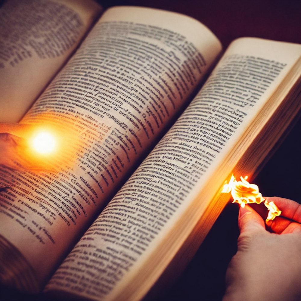 a hand under a book with a burning lighter