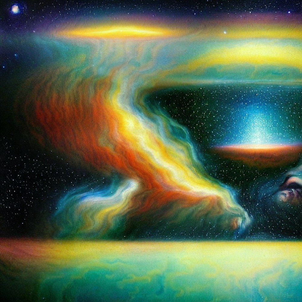 landscape painting of a beautiful human face gently transforming into a time/space rift revealing a lush galaxy beneath it; all painted in the style of a 1970's progressive rock album cover