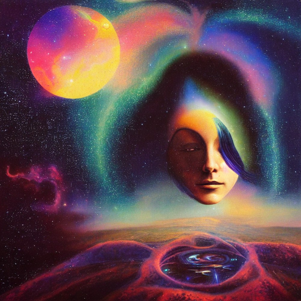 landscape painting of a beautiful human face gently transforming into a time/space rift revealing a lush galaxy beneath it; all painted in the style of a 1970's progressive rock album cover