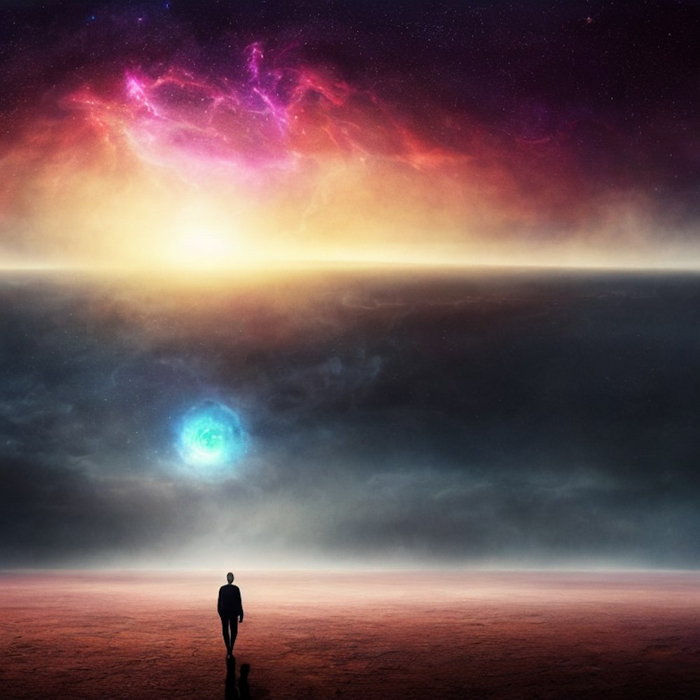 vast, flat landscape with the silhouette of a beautiful human being walking towards us, with a cosmic void opening behind them, revealing layers of universes and worlds within it.