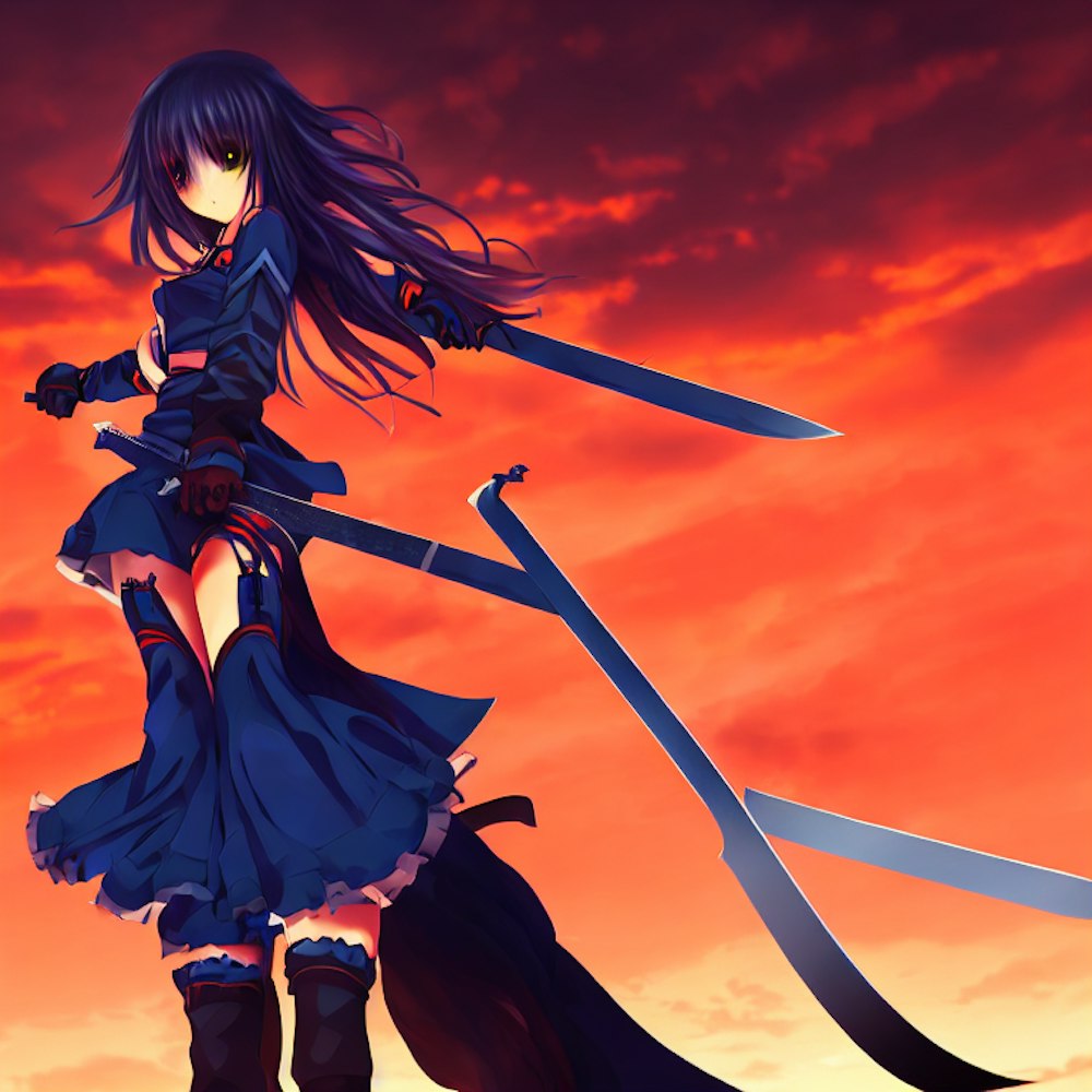 anime girl with sword and blue + dark orange sky
