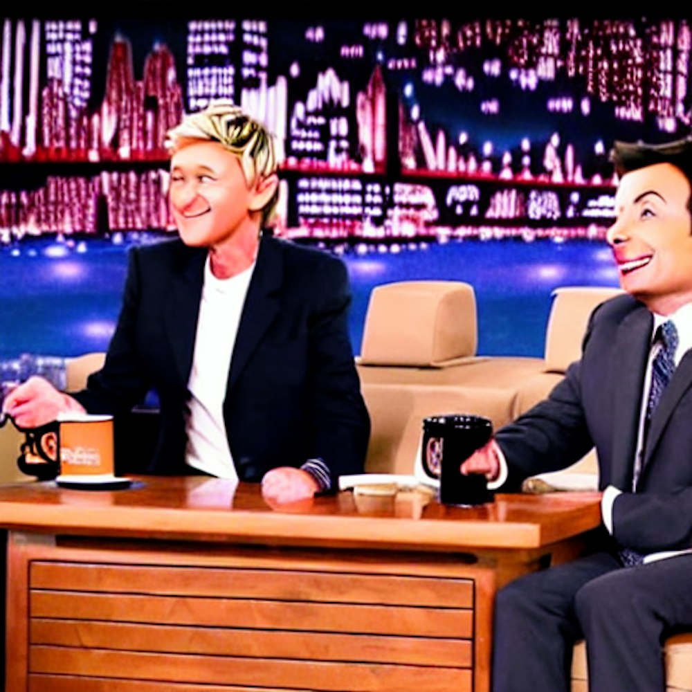ellen, dr phil, jimmy fallon, and walle the robot sitting on a couch in outer space, hd, high quality, super detailed, hyper detailed, photography, intricate design, photorealistic
