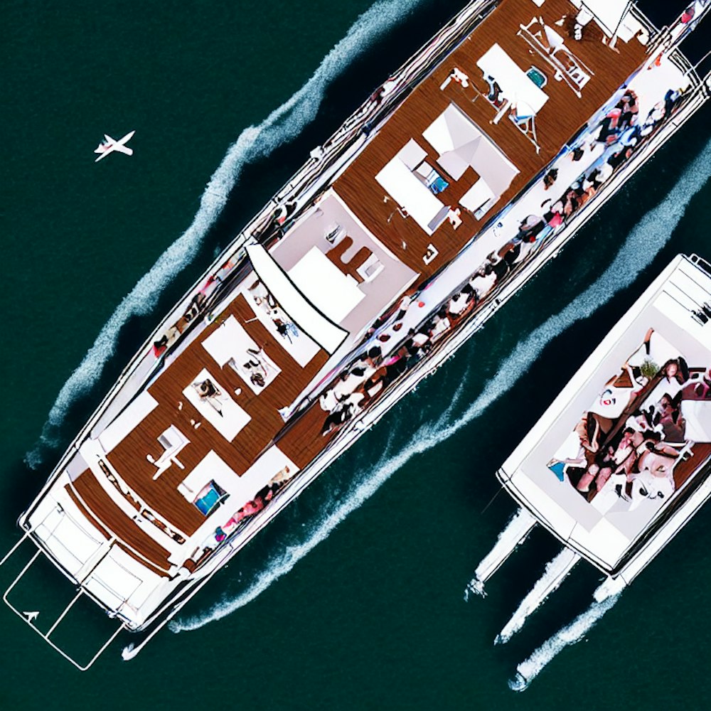 Create an image using digital art of a party at night taking place on a yacht from a Birds Eye view