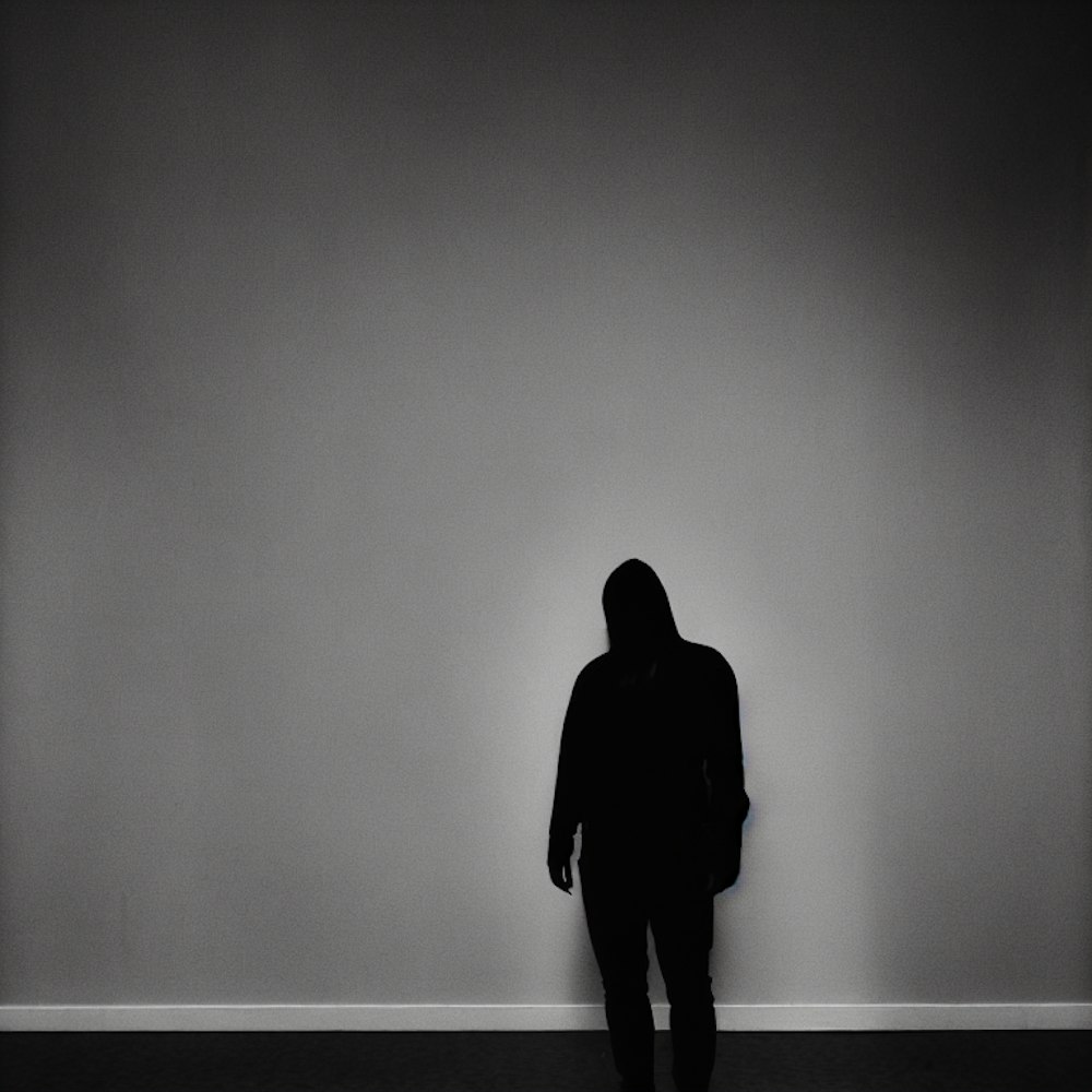 Dark, gloomy yet colourful room with a dark figure standing in the centre