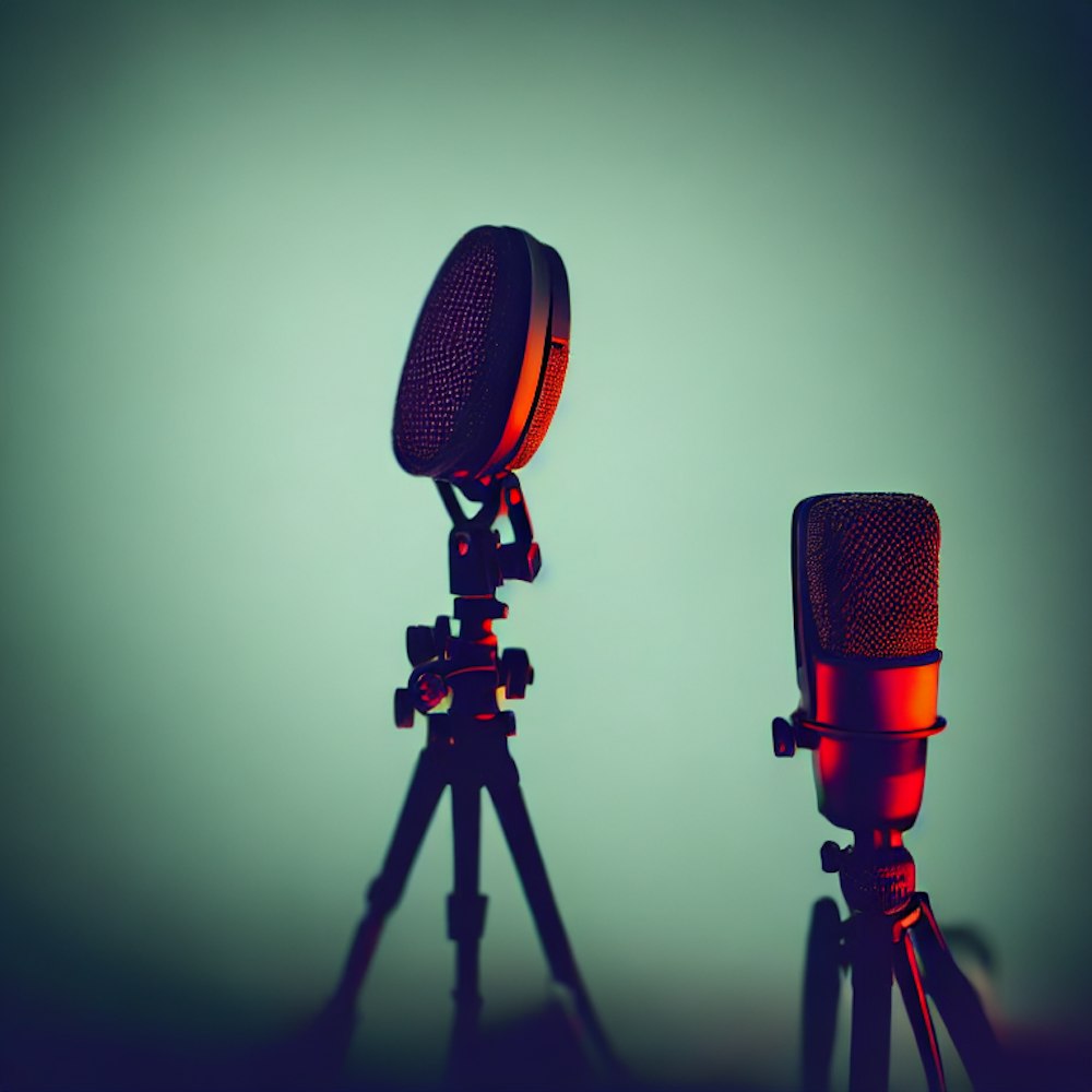 Dark, colourful room with a dark figure standing in the centre holding a microphone