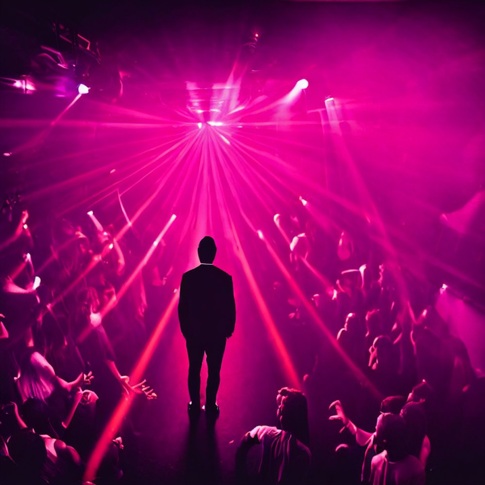 Dark, colourful room with a dark figure standing in the centre of a nightclub, crowd surrounding