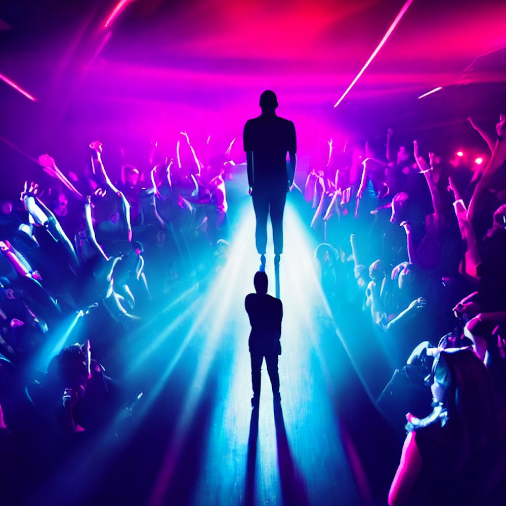 Dark, colourful room with a dark figure standing in the centre of a nightclub, crowd surrounding