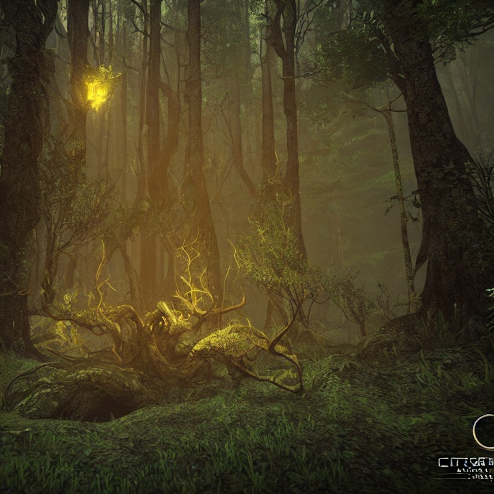 deep in the woods with a clearing with an otherworldly, non- plant eldritch beast created out of pure nostalgia and deep regret