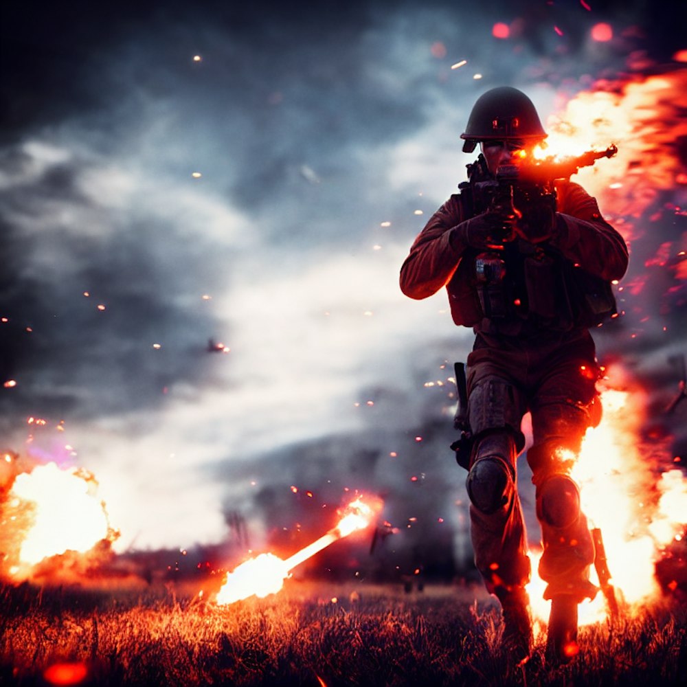Cinematic Battlefield with explosions, fire, bombs, planes and people shooting