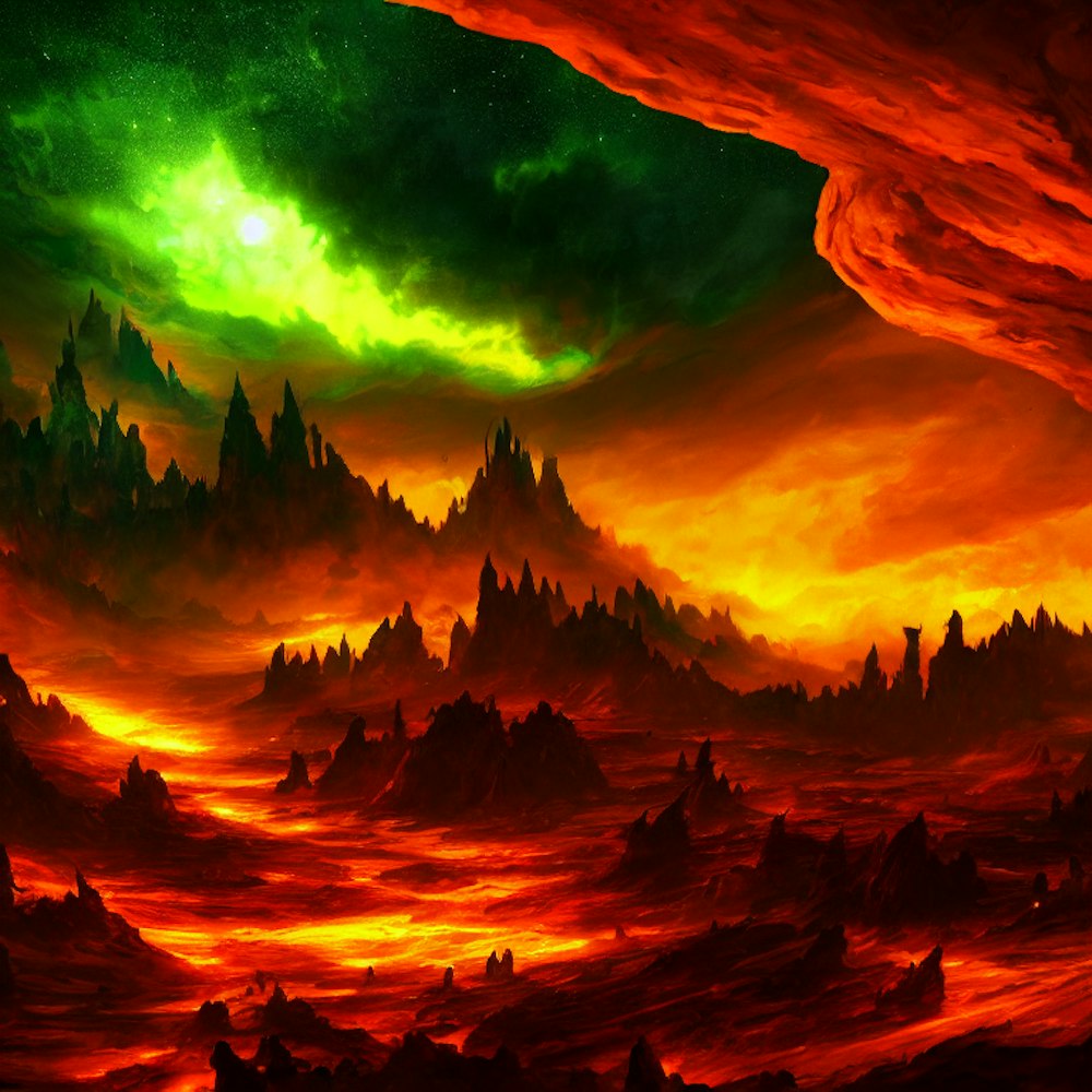 beautiful green landscape with the same landscape in a hellish fiery state upside down in the sky