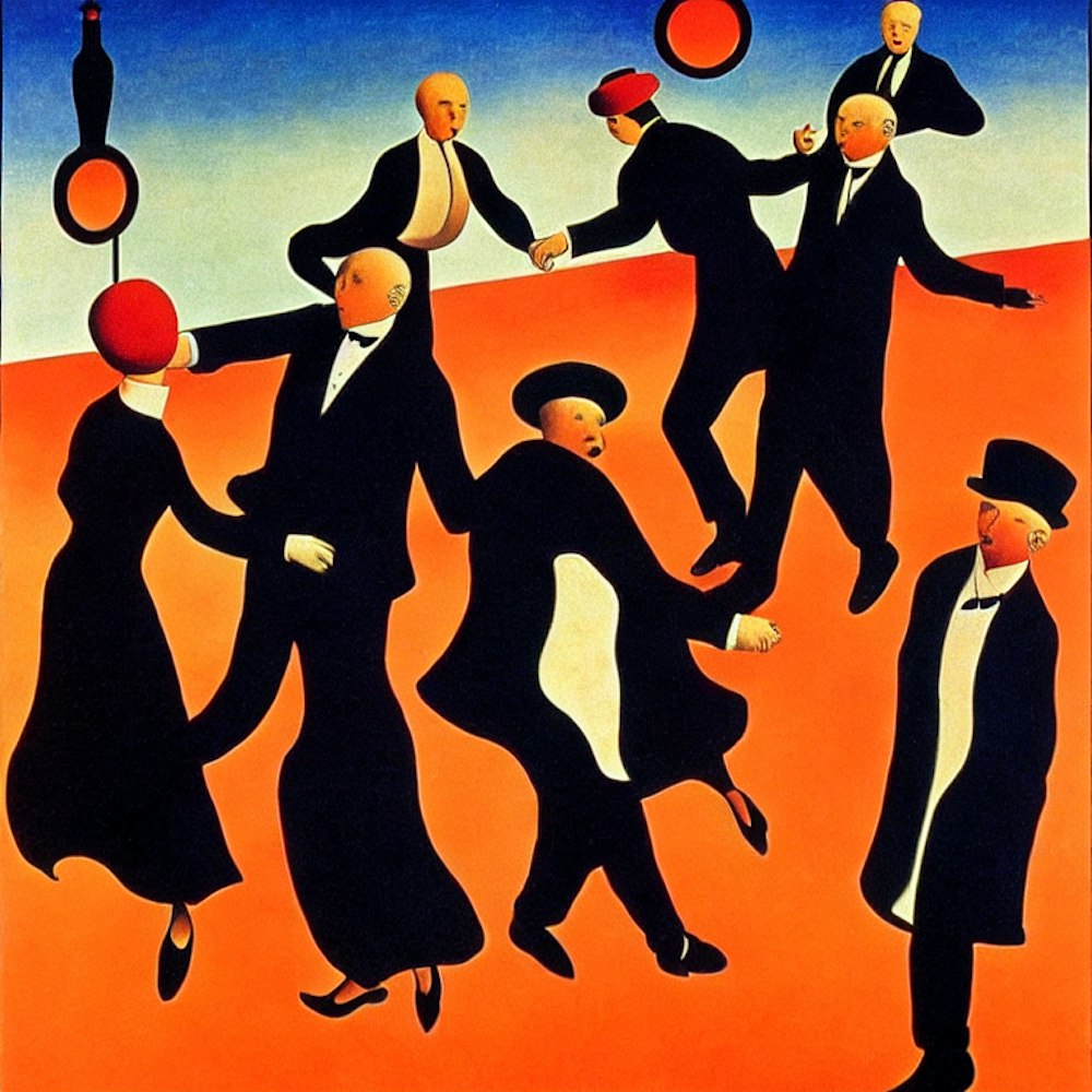 people dancing, style rene magritte and kadinsky