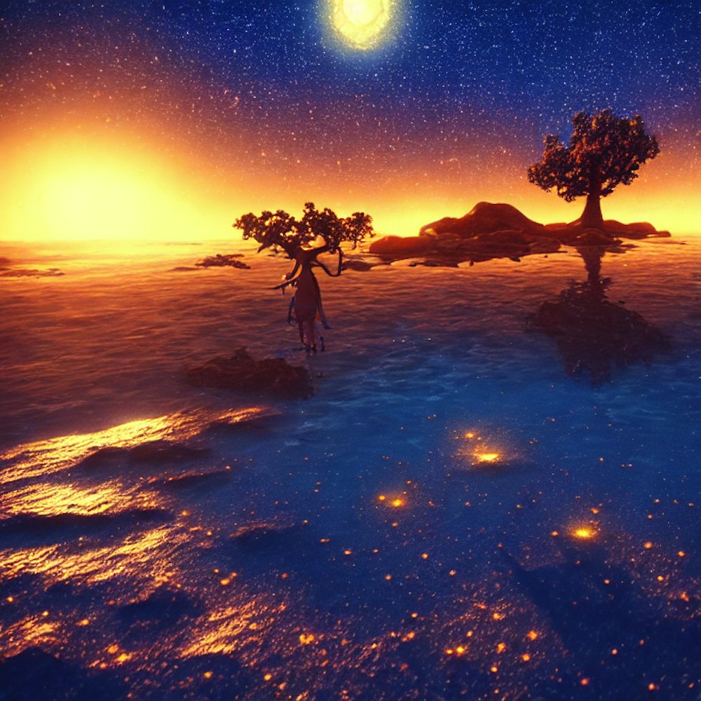 Sunset beach gold sand positive happiness blue sky motivation meditation tree stars