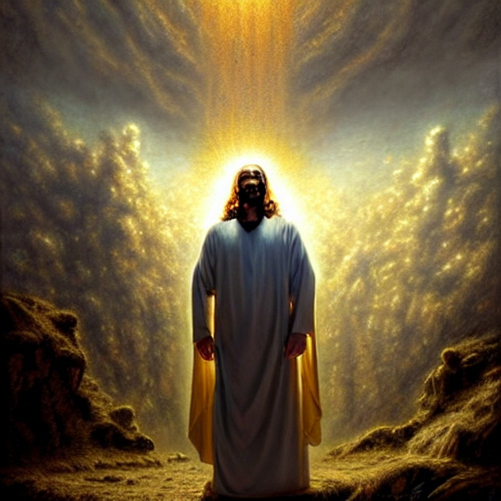 a portrait of Jesus Christ crying, wearing a crown of gold and diamonds fantasy character portrait, Heaven landscape, ultra-realistic, cinematic, concept art, wide angle, intricate details, hologram, highly detailed by greg rutkowski, aaron horkey, gaston