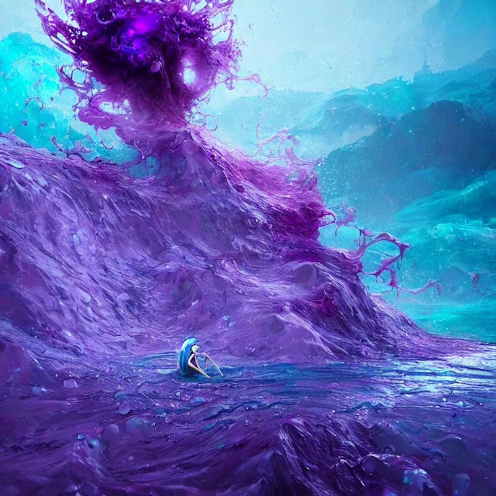 purple water in one cup. The water is drowning down into a ocean full of pills