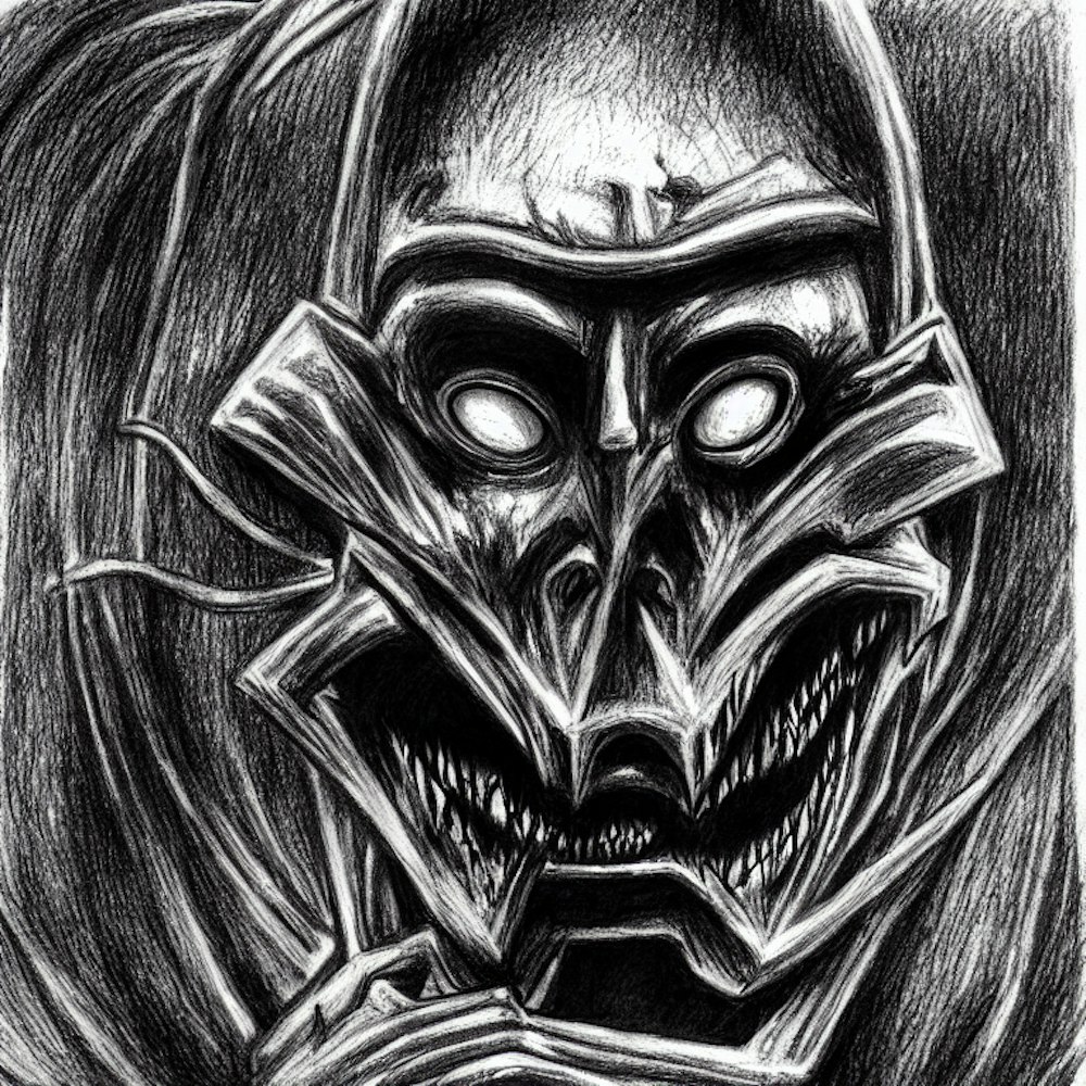 analogue vhs horror mask drawn with charcoal pencils, easily drawn, evil, far away