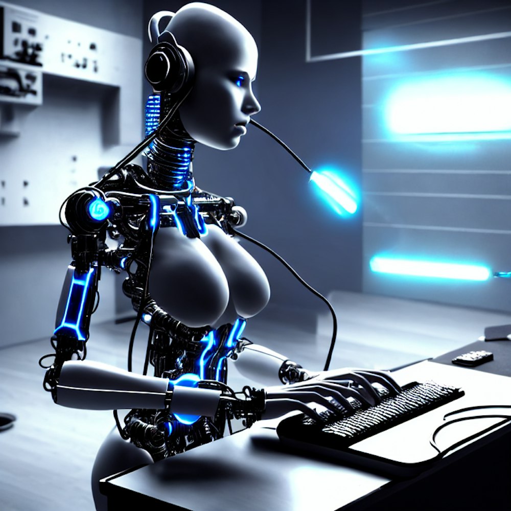 a cyborg using a keyboard and headphones