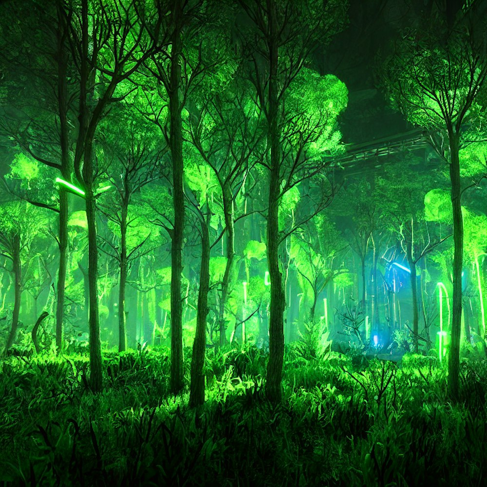 Neon rave lasers dystopian forest field ultra realism 4k