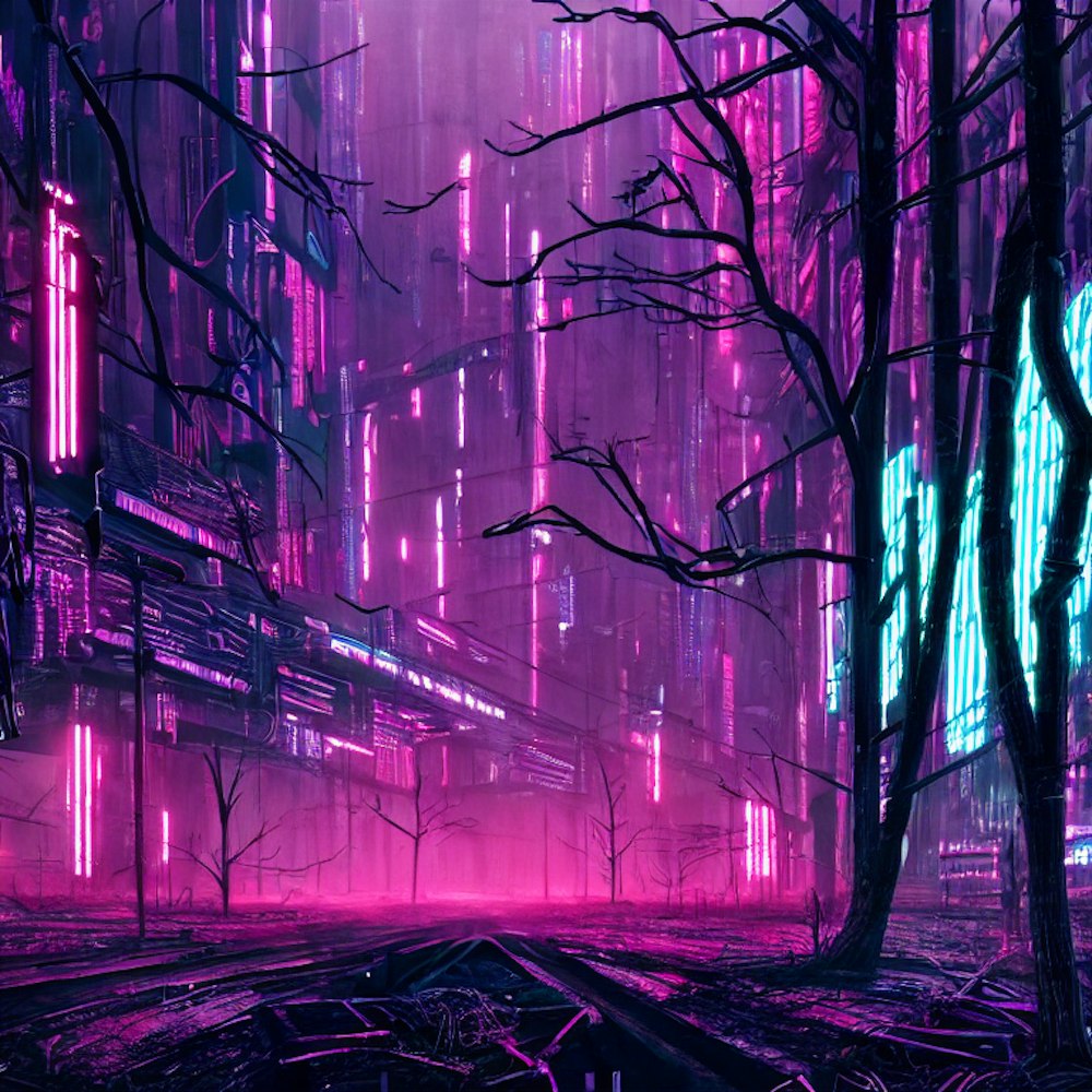 Neon stripped woodland in a dystopian cyberpunk 4k image