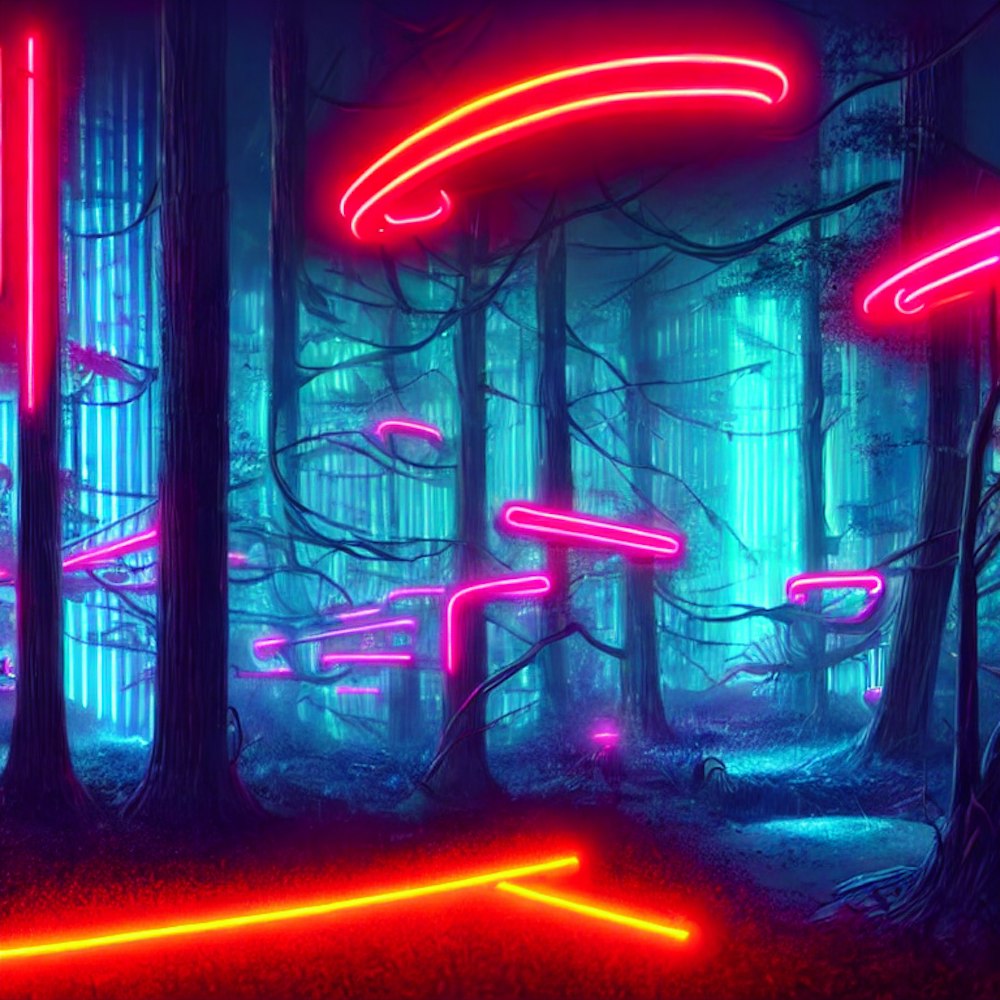 Warm Neon tube woodland in an ultra realistic dystopian cyberpunk 4k vibrant image