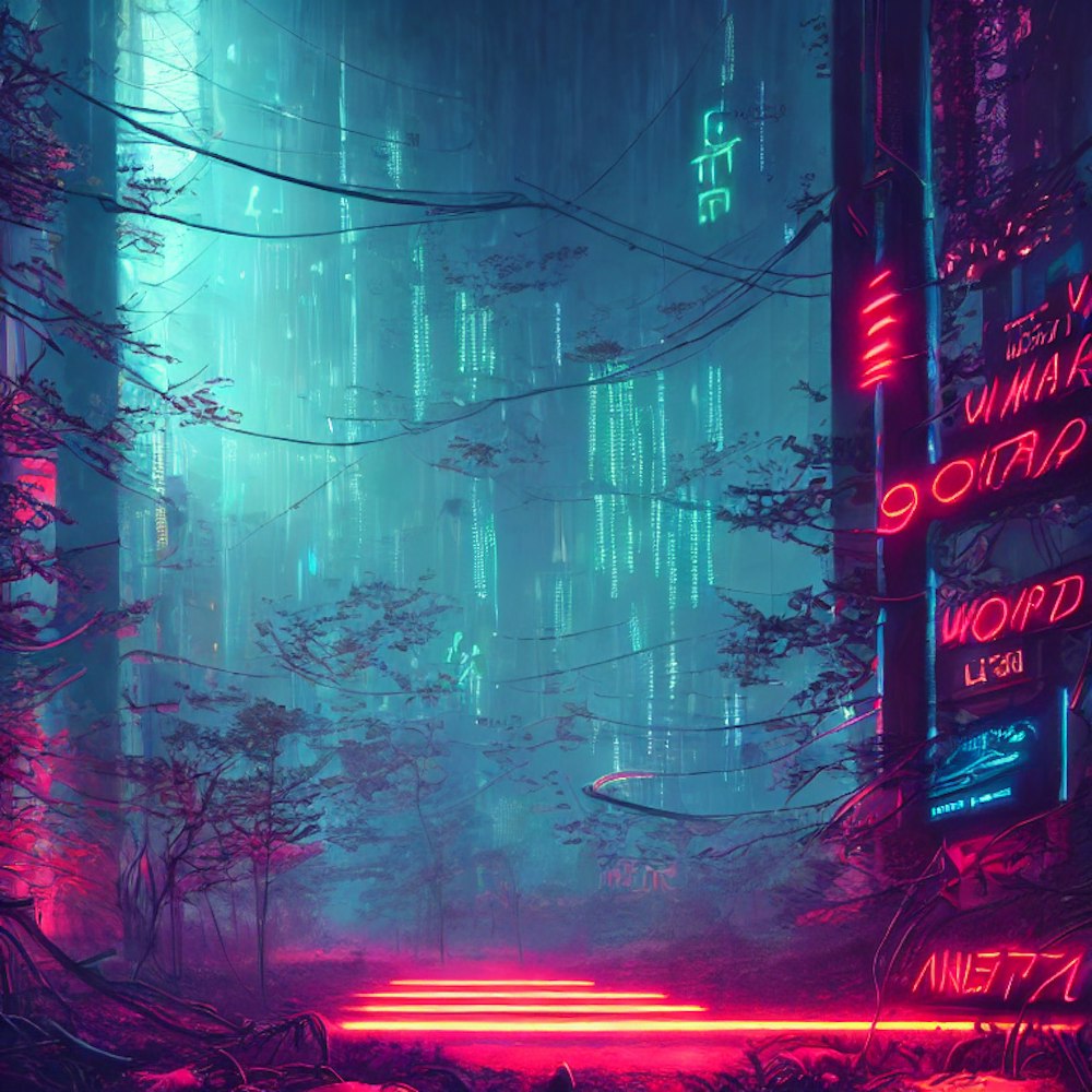 Warm Neon lit woodland in an ultra realistic dystopian cyberpunk 4k vibrant image
