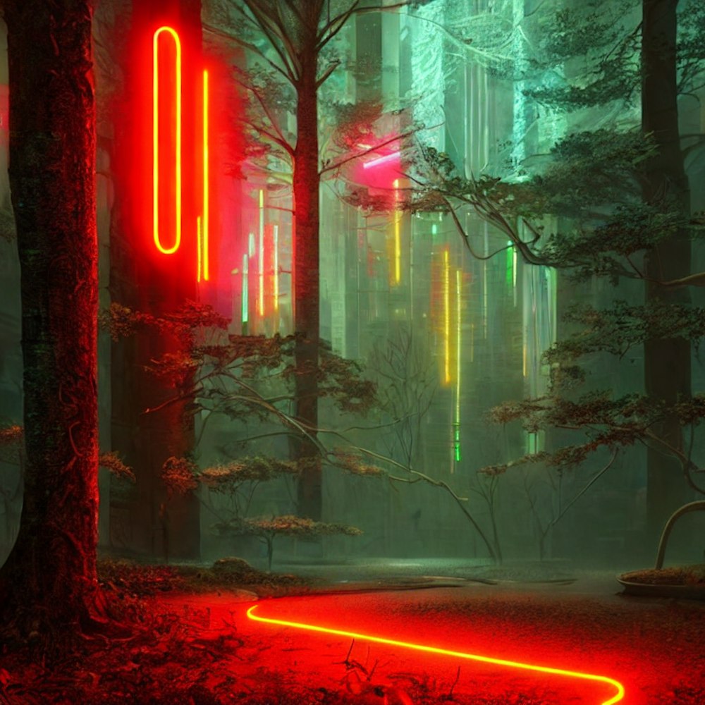Warm Neon lit minimal woodland in an ultra realistic vibrant dystopian cyberpunk 4k image