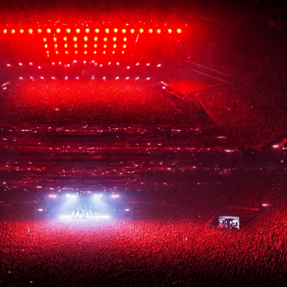 Man on stage in front of a crowd preforming in a stadium with red lights