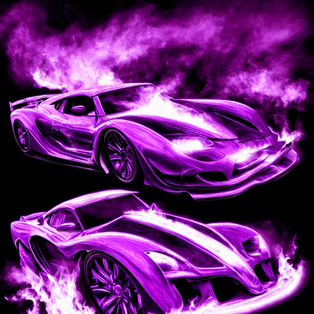 purple car drifting in purple burning flames