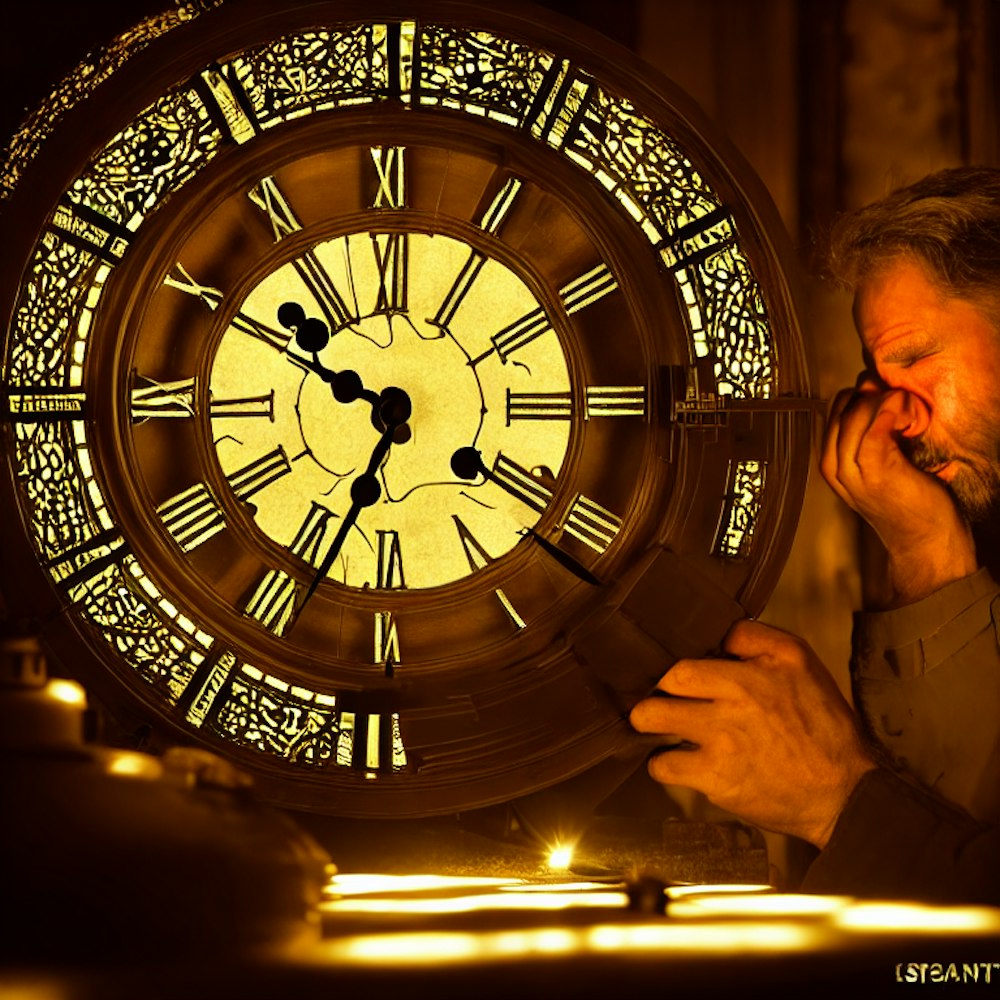 crying man working at night fixing a clock