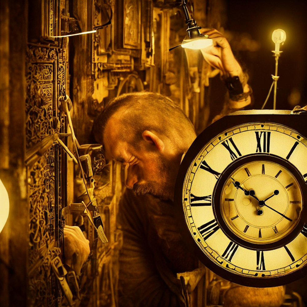 crying man working at night fixing a clock