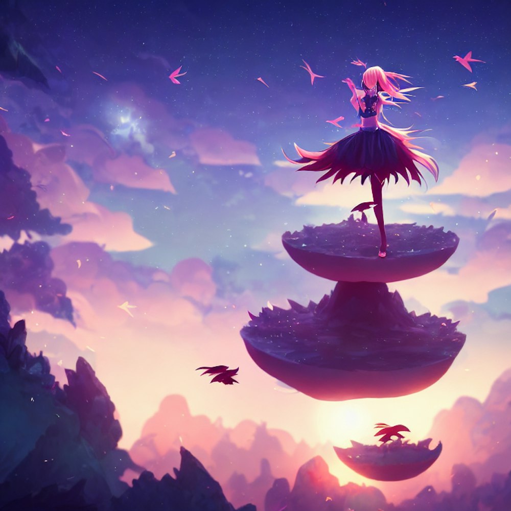 Cartoon style An anime girl dancing on top of a big floating island with birds flying around her