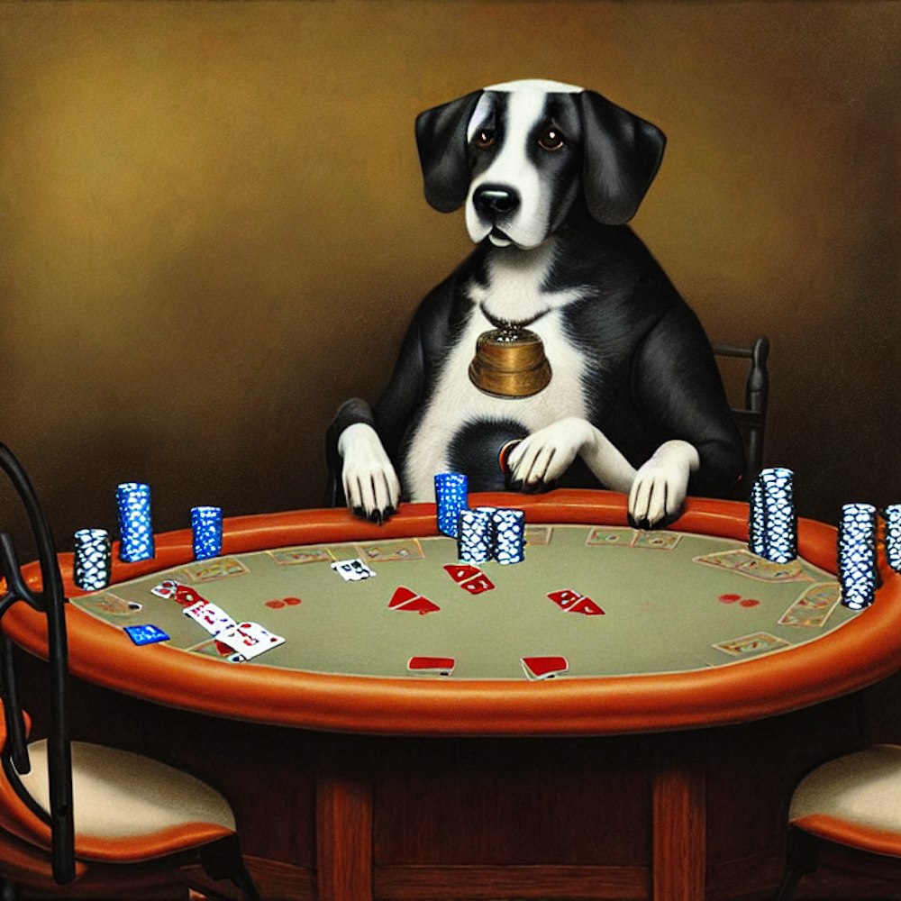 Dog with cylinder playing Poker