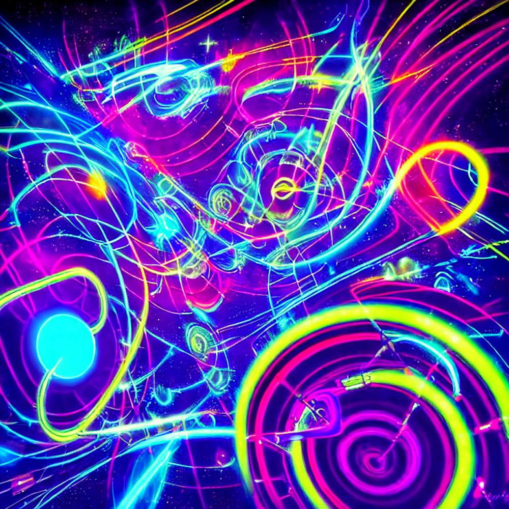 "Prepare to embark on a visual journey through the digital cosmos with 'Electric Reverie,' the AI art program's electrifying album. The cover pulses with vibrant energy, a cosmic fusion of technology and imagination. A kaleidoscope of neon colors swirls and dances against a backdrop of deep, starlit space, as if to say, 'This is where the digital and the divine collide.'