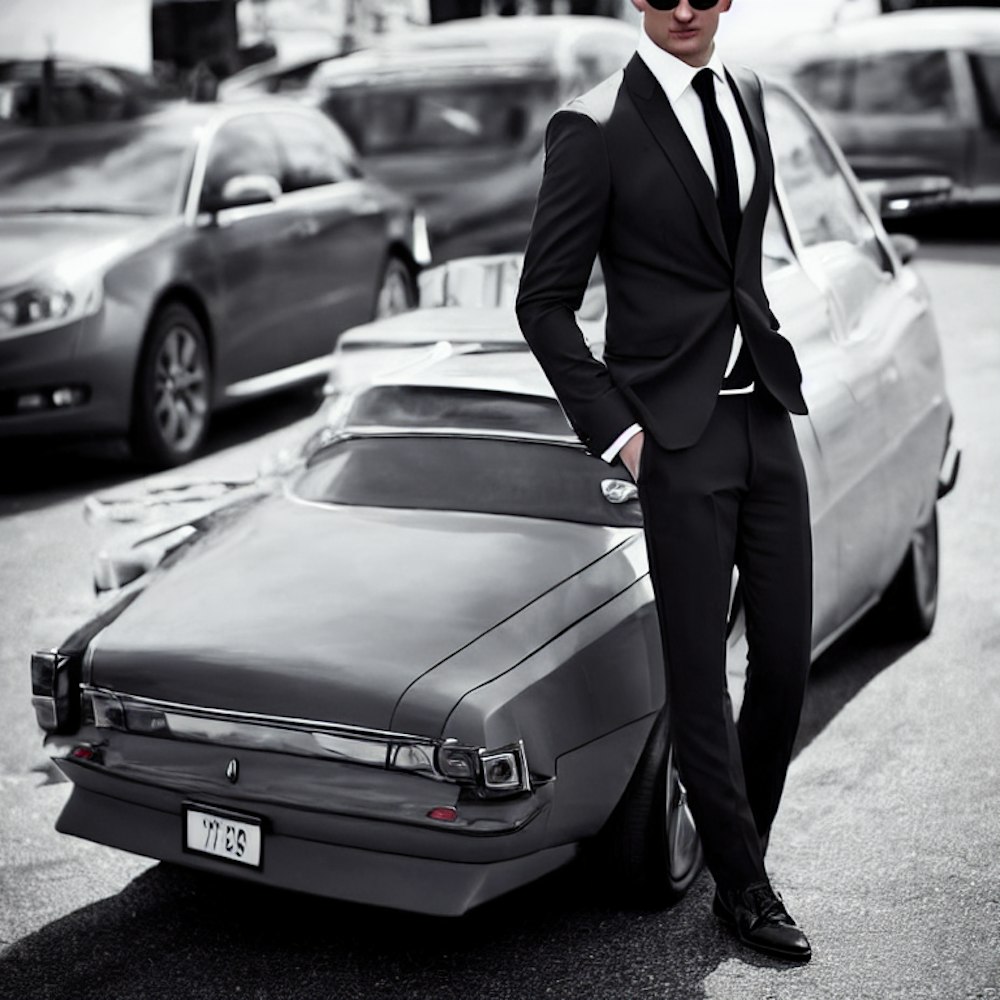 Standing near the car, an impeccably dressed individual exudes sophistication. The person is adorned in a tailored charcoal gray suit that fits like a second skin. A crisp white shirt and a slim black tie add a touch of classic refinement. Their shoes are immaculately shined, and sunglasses rest casually in the open collar of the shirt. The person exudes an air of quiet confidence as they lean against the car, catching the last rays of sunlight. A subtle, enigmatic smile plays on their lips, adding an element of intrigue.