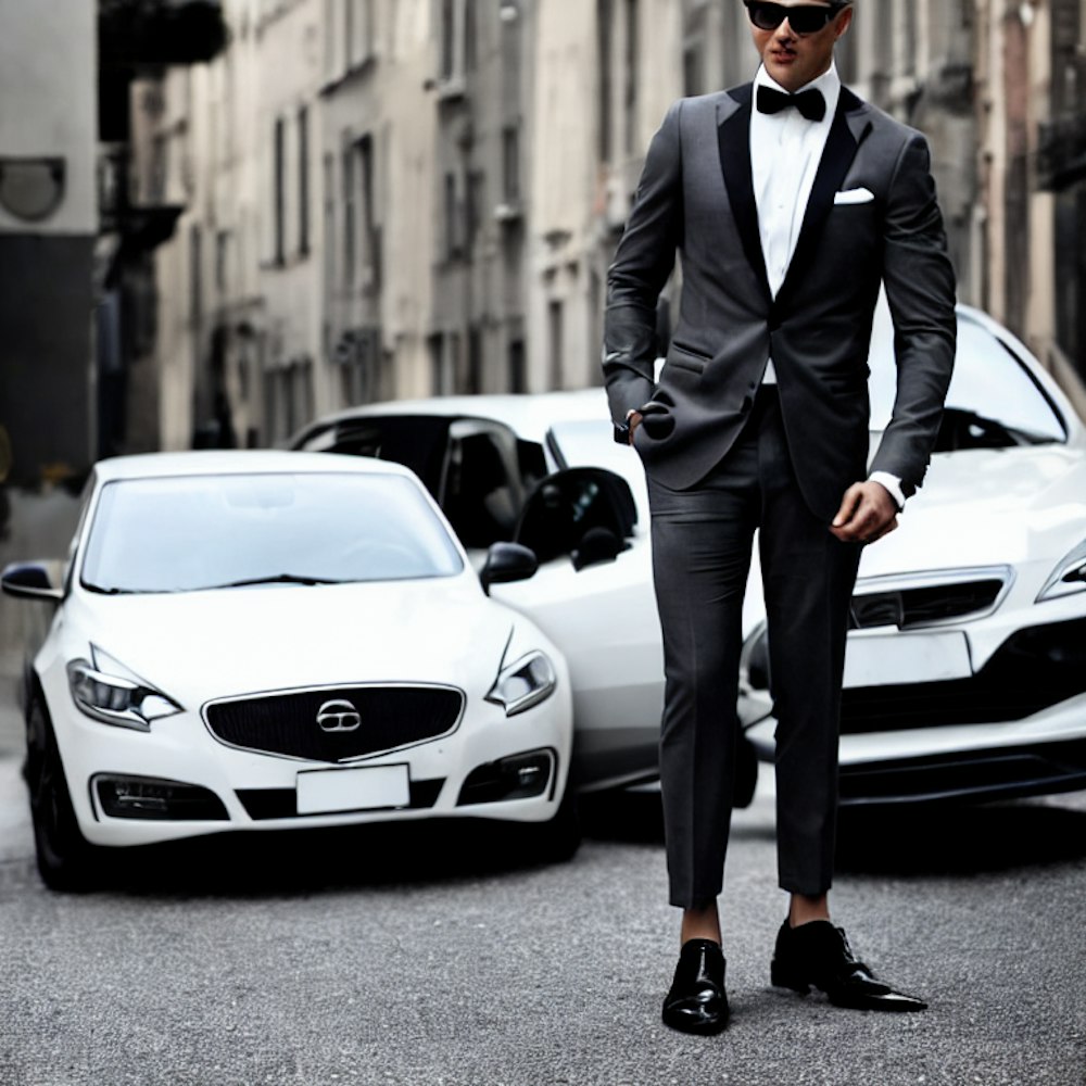 Standing near the car, an impeccably dressed individual exudes sophistication. The person is adorned in a tailored charcoal gray suit that fits like a second skin. A crisp white shirt and a slim black tie add a touch of classic refinement. Their shoes are immaculately shined, and sunglasses rest casually in the open collar of the shirt. The person exudes an air of quiet confidence as they lean against the car, catching the last rays of sunlight. A subtle, enigmatic smile plays on their lips, adding an element of intrigue.