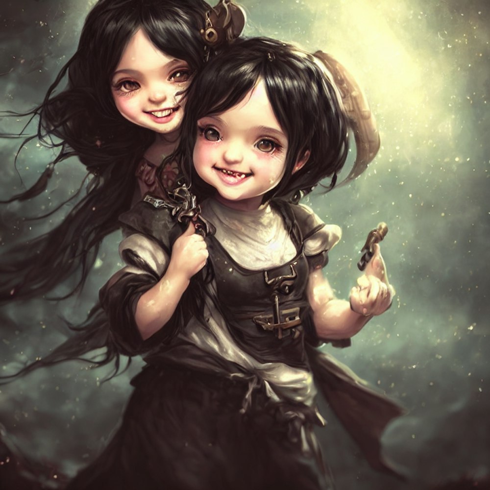 little girl, black hair, smile, ragged clothes, cute, fantasy, medieval background