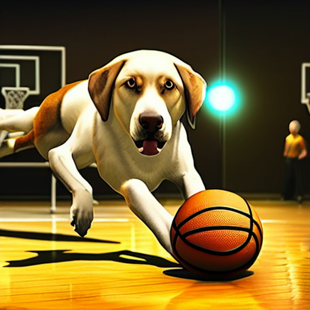 dog playing with basketball
