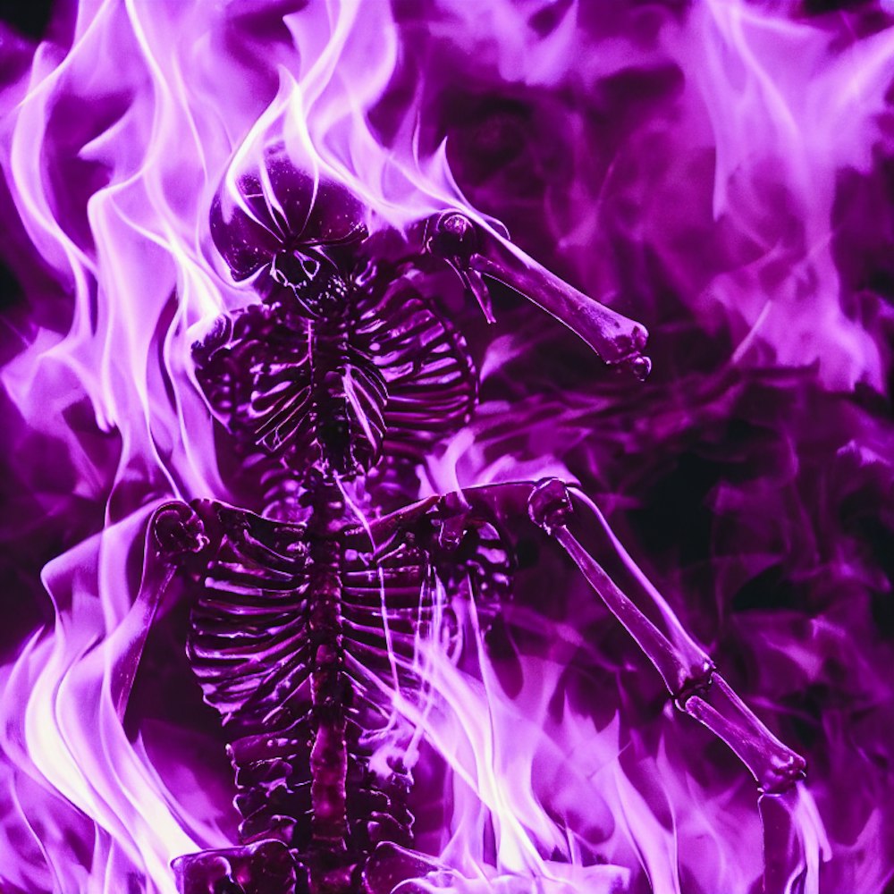 exhausted purple skeleton in purple flames sitting in a purple fmae burning fire while looking down