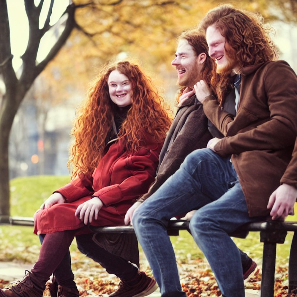 a man and a woman sitting on a park bench, looking happy and relaxed. the man has blonde, wavy hair and the woman has long reddish brown hair. They are dressed warmly in browns and reds. they are friends.