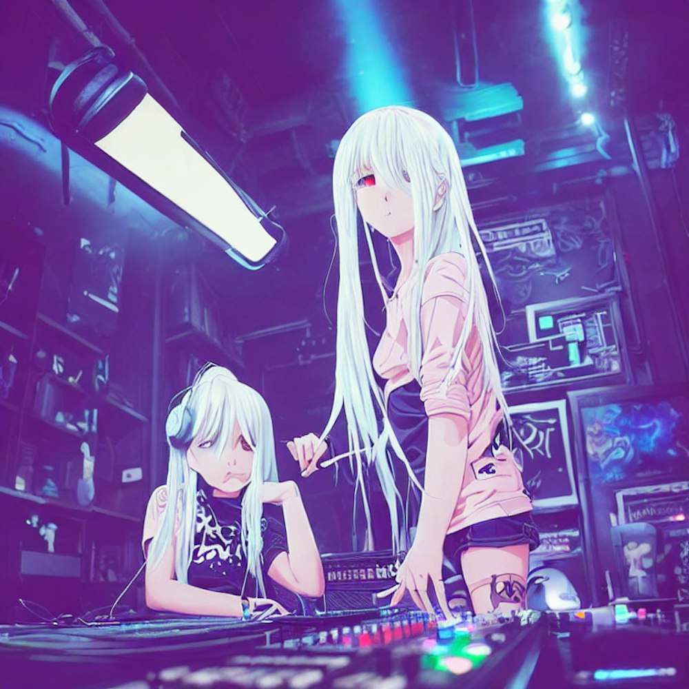 Anime Lofi girl with white hair as a hip hop dj in a club