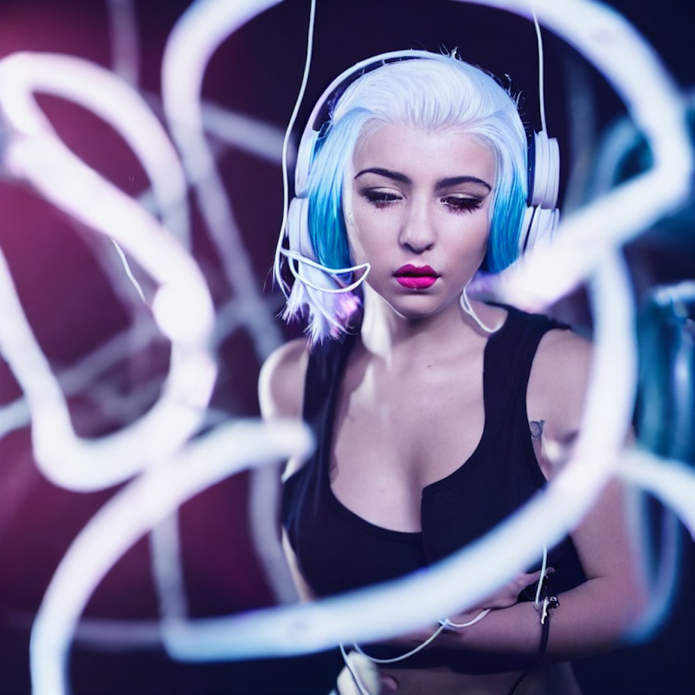 Beautiful woman with white hair and headphones as a hip hop dj in a club