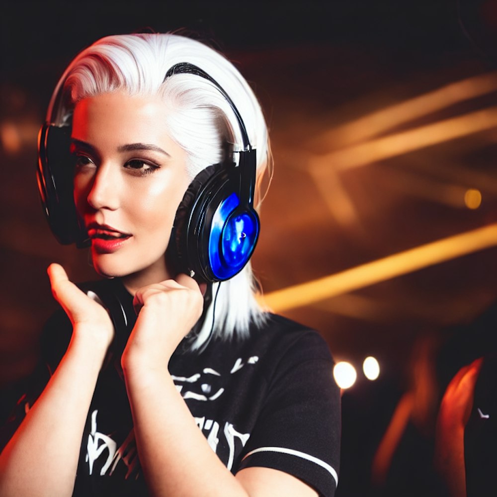 Beautiful woman with white hair and headphones as a hip hop dj in a club