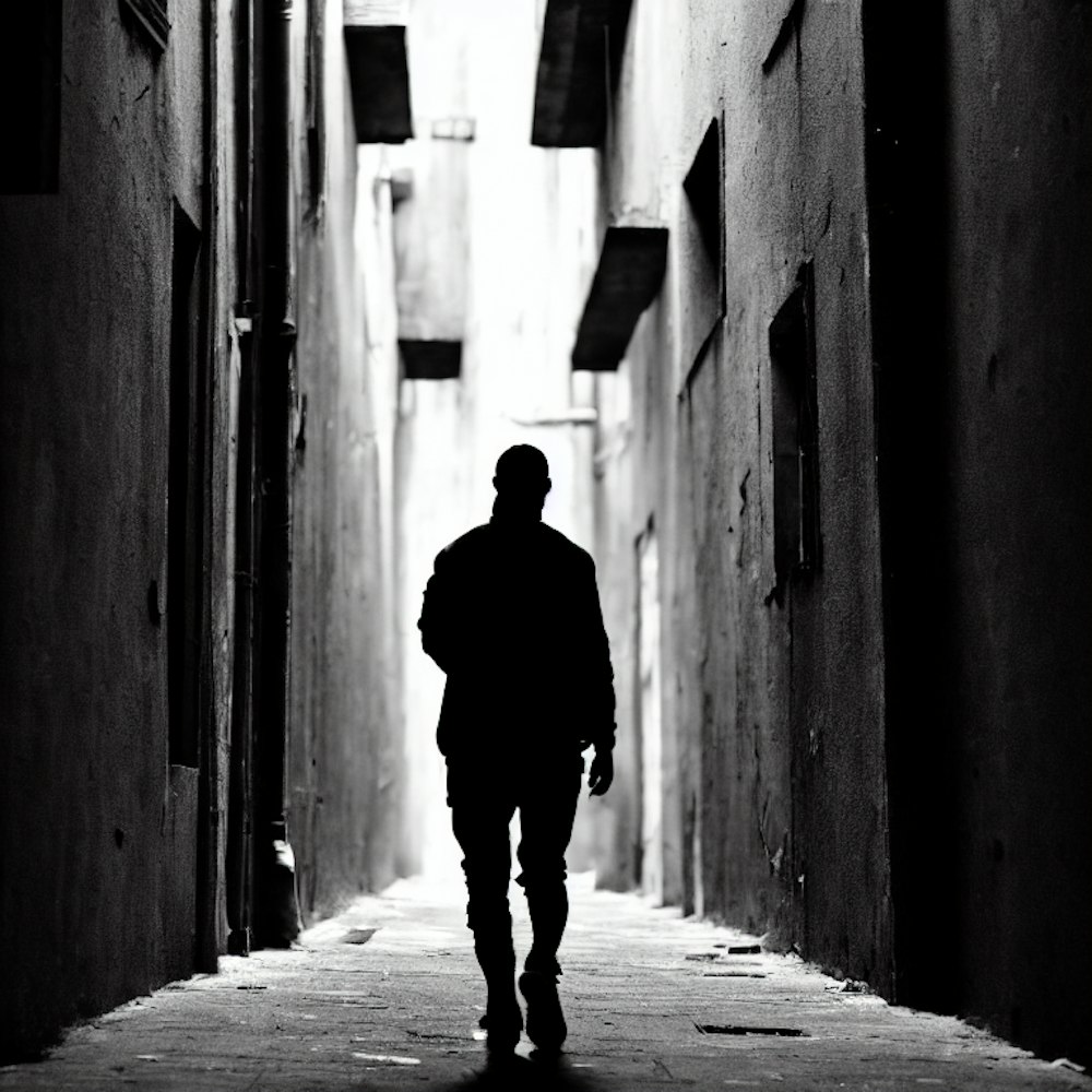 Black figure walking down an alleyway
