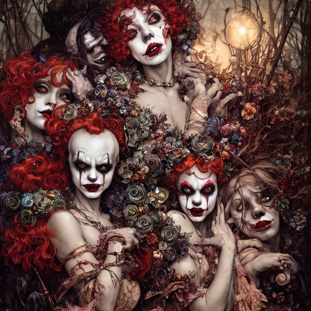 Dead clowns, Drugs, High Detail, Cinematic Lighting at dark Christmas