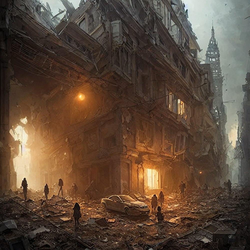 family stuck in warzone, sad, smoke in streets, crumbled buildings
