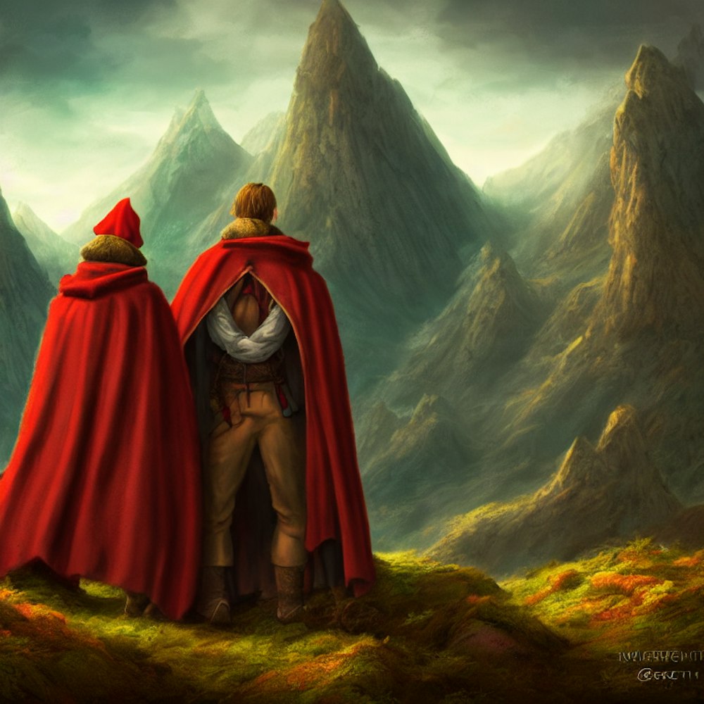 two people with brown and red cloak standing in verdant mountain range pastel cartoon